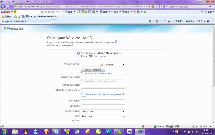 然后到:[url]http://home.live.com/default.aspx,如果已经登录的话,先Sign Off。然后再点右上角的Sign In。在出来的界面中点左边的Sign up按钮。然后IE会重定向到一个网址,最后到注册的页面。