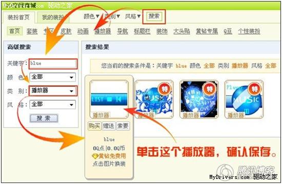 1、拥有音乐播放器:点击右上角“装扮空间”-搜索-关键字(blue)-类别(播放器)-点选-保存。