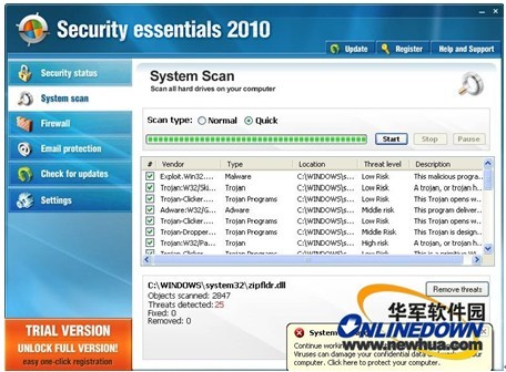 最重要的就是,如同其他任何可疑程序一样,Security Essentials 2010还以“系统包含大量恶意代码”为由,欺骗用户花钱购买许可证。在此,笔者需要提醒大家的是,千万不要被这些假冒的防病毒程序所欺骗,以免浪费不必要的金钱。